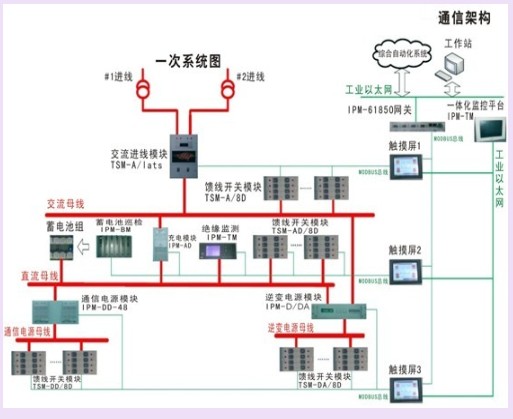 該系統(tǒng)對電源進行全面整合:將交流電源系統(tǒng)、直流電源系統(tǒng)、逆變電源系統(tǒng)、通信電源系統(tǒng)統(tǒng)一設(shè)計、監(jiān)控、生產(chǎn)、調(diào)試、服務(wù);通過一體化監(jiān)控模塊將電源各子系統(tǒng)通信網(wǎng)絡(luò)化,實現(xiàn)電源信息共享,建立智能電源軟件平臺;通過將電源所有開關(guān)智能模塊化,集中功能分散化,實現(xiàn)模塊外無二次接線,無跨屏二次電纜,建立數(shù)字化電源硬件平臺;一體化監(jiān)控模塊通過以太網(wǎng)接口、IEC61850規(guī)約與上位機系統(tǒng)通信,使電源系統(tǒng)成為開放式系統(tǒng)。