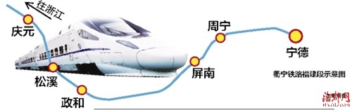 衢寧鐵路共設15個車站,位于浙西南和閩東北地區(qū),北起浙江省衢州市,途經龍游、遂昌、松陽、龍泉、慶元進入福建,經松溪、政和、建甌東、屏南、周寧引入沿海鐵路寧德。鐵路正線全長約366.5公里,工程投資預估算總額307億元,建設工期5.5年,國鐵Ⅰ級標準建設,運輸能力:客車40對/日,貨運6000萬噸/年。